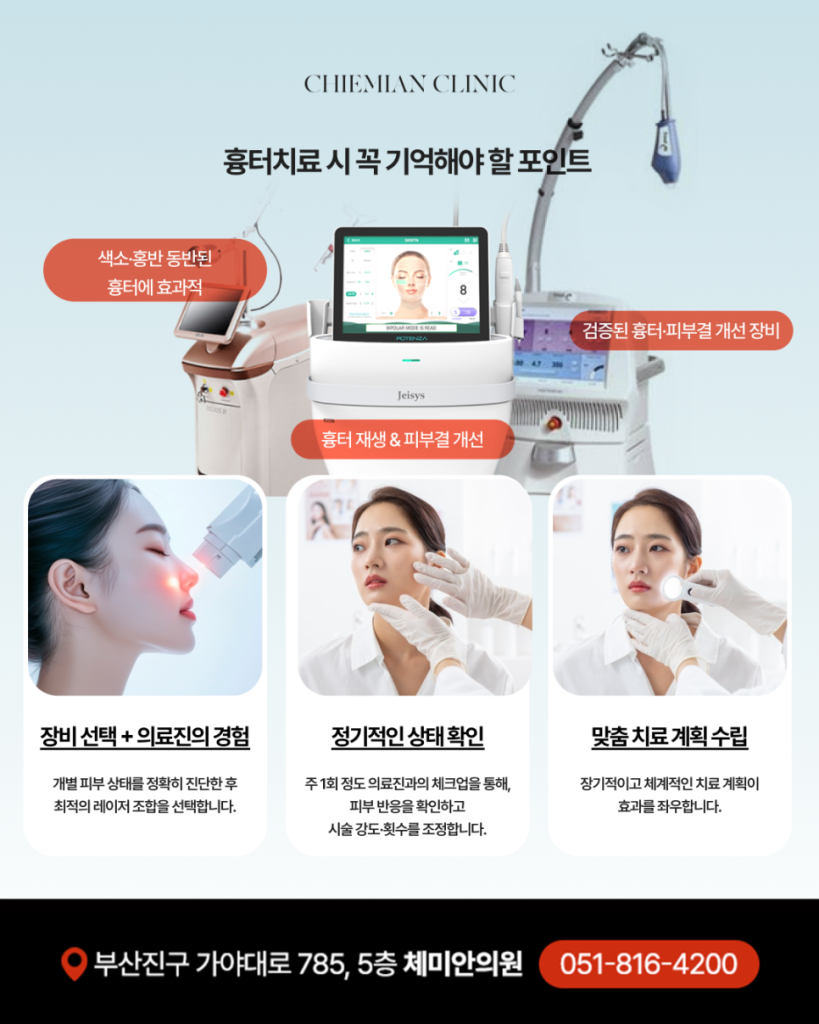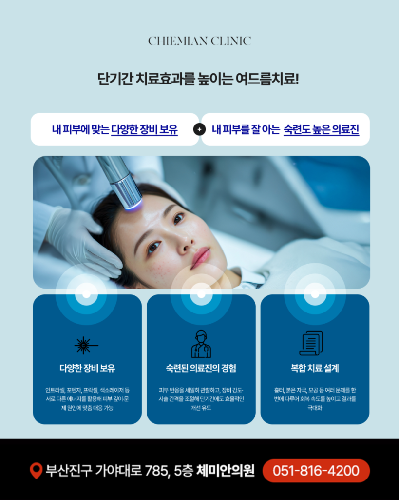 환자 개개인의 상태를 꼼꼼히 분석해 최적의 치료 조합을 제안합니다.여드름흉터로 고민 중이라면, ‘서면흉터레이저추천’ 클리닉인 서면체미안에서 안전하고 효과적인 치료를 경험해보시기 바랍니다.
