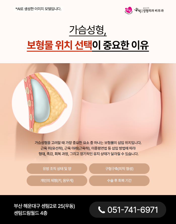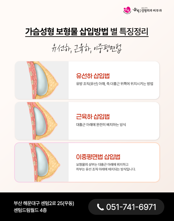 유선하 배치방식은 유방 실질조직 바로 아래, 대흉근 상부 공간에 보형물을 안착시키는 방법입니다. 이 기법은 근육층을 건드리지 않는다는 특징이 있으며 근육하 방식은 대흉근의 깊은 층에 보형물을 완전히 삽입하는 형태를 말합니다. 이중평면법은 보형물의 상단은 대흉근 아래에 위치시키고 하단은 유선 및 피하 연부조직 하부로 배치하여 두 구조가 두면에 걸쳐 위치하는 방법을 말합니다.
