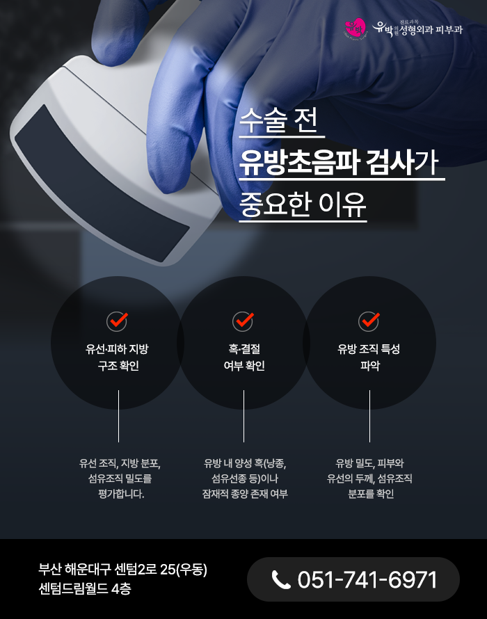 많은 분들이 가슴성형을 계획하실 때, 보형물의 종류나 절개 위치를 먼저 떠올리시지만 실제로 가장 우선 시 해야 하는 절차는 유방 구조평가, 그 중에서도 유방 초음파 검사입니다. 유방은 유선, 지방층, 섬유조직, 결합조직이 복잡하게 뒤섞여 있는 구조입니다. 초음파 검사는 가각각의 구성 비율을 확인하는 과정이며 이러한 검사를 통해 섬유선종, 낭성 변화, 지방괴사 등 양성 병변의 존재여부를 확인하게 됩니다.