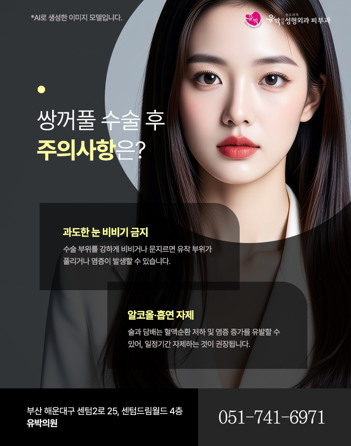 수술 후 눈 주위는 상안검 피부와 근육, 유착 조직이 회복 중인 상태입니다. 이때 손으로 강하게 문지르거나 눈을 비비는 행동은 유착이 풀리거나 조직 손상을 유발할 수 있으며, 염증 발생 가능성을 높입니다. 또한, 상처 부위의 혈관이 손상되면 출혈과 멍이 발생할 수 있으며, 회복 과정이 지연되거나 쌍꺼풀 라인이 비대칭으로 형성될 위험도 존재합니다.