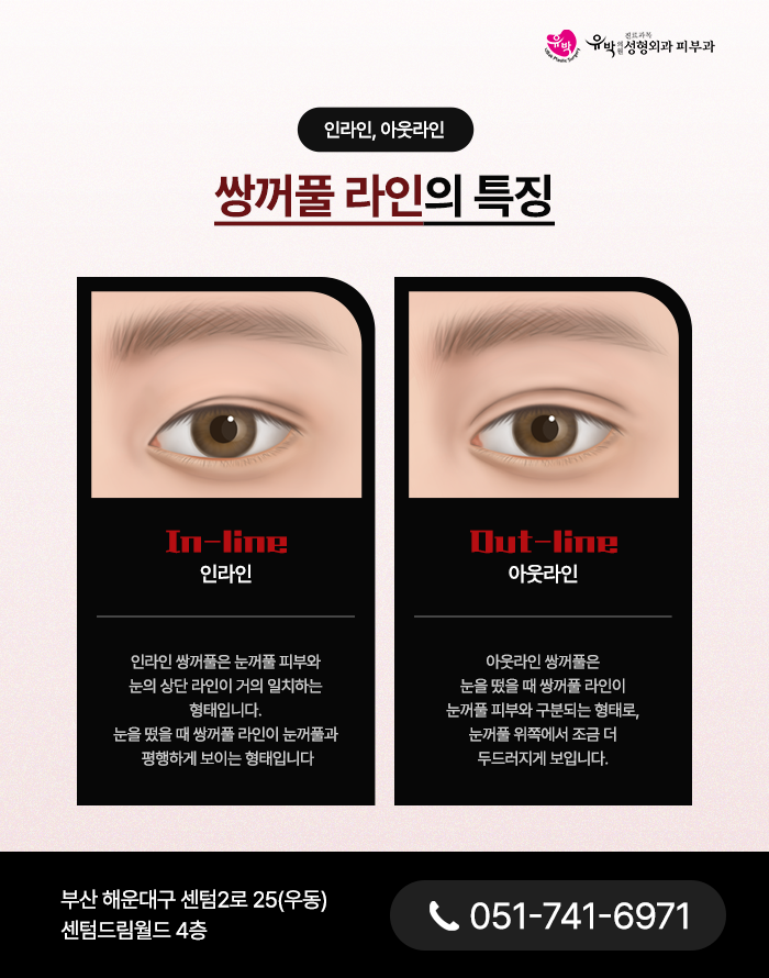 ​인라인은 눈꺼풀 피부와 쌍꺼풀 라인이 거의 일치하는 형태로 눈을 뜰 때 평행하게 나타납니다.