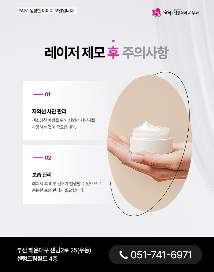 ​레이저 시술 이후 피부는 색소반응에 대한 민감도가 증가한 상태이기 때문에 자외선에 노출될 경우 염증 후 색소침착으로 이어질 가능성이 높아집니다. 따라서 외출 시에는 자외선차단제를 충분히 도포해야 합니다. 또한 열 자극은 피부의 수분손실을 증가시킬 수 있으며 이로 인해 건조감이나 일시적인 거칠어짐이 나타날 수 있습니다. 이러한 상태를 방치할 경우 장벽 회복이 지연될 수 있기 때문에 충분한 수분공급과 보습관리가 권장됩니다.