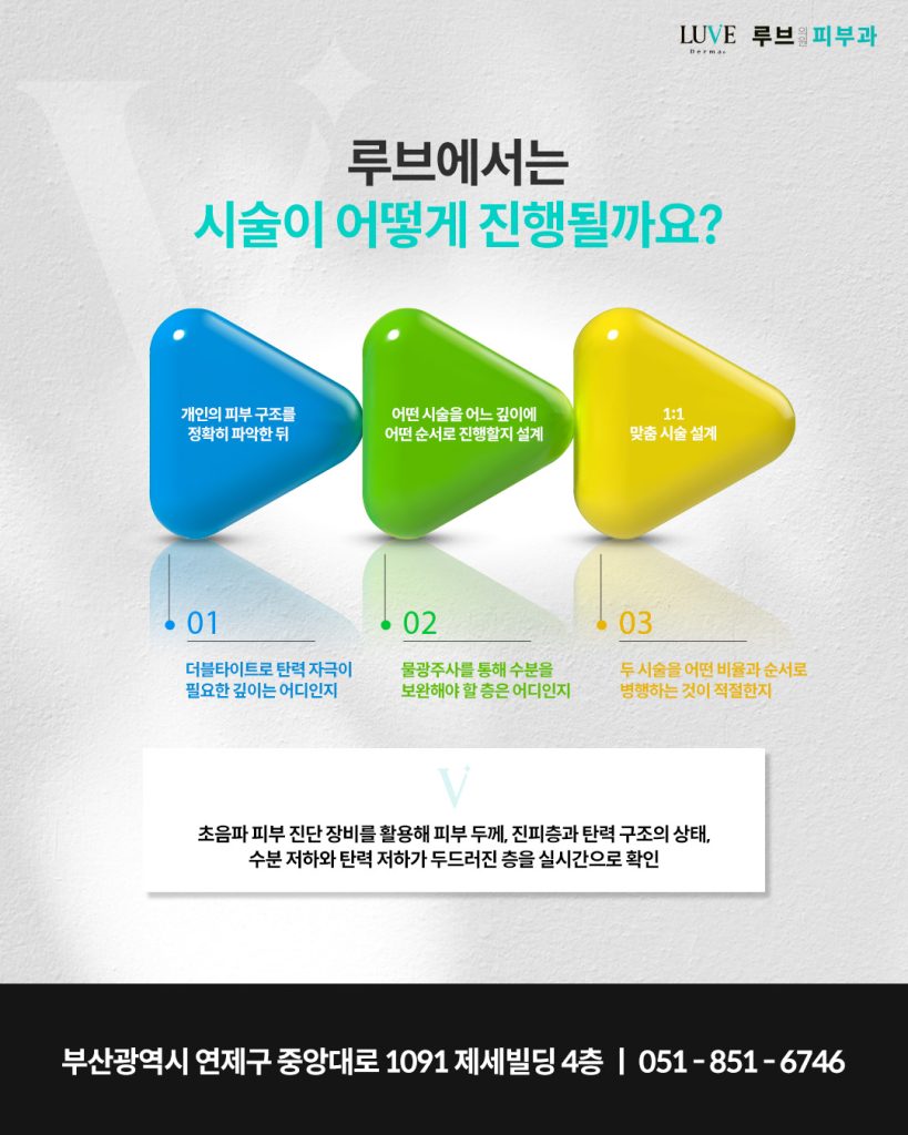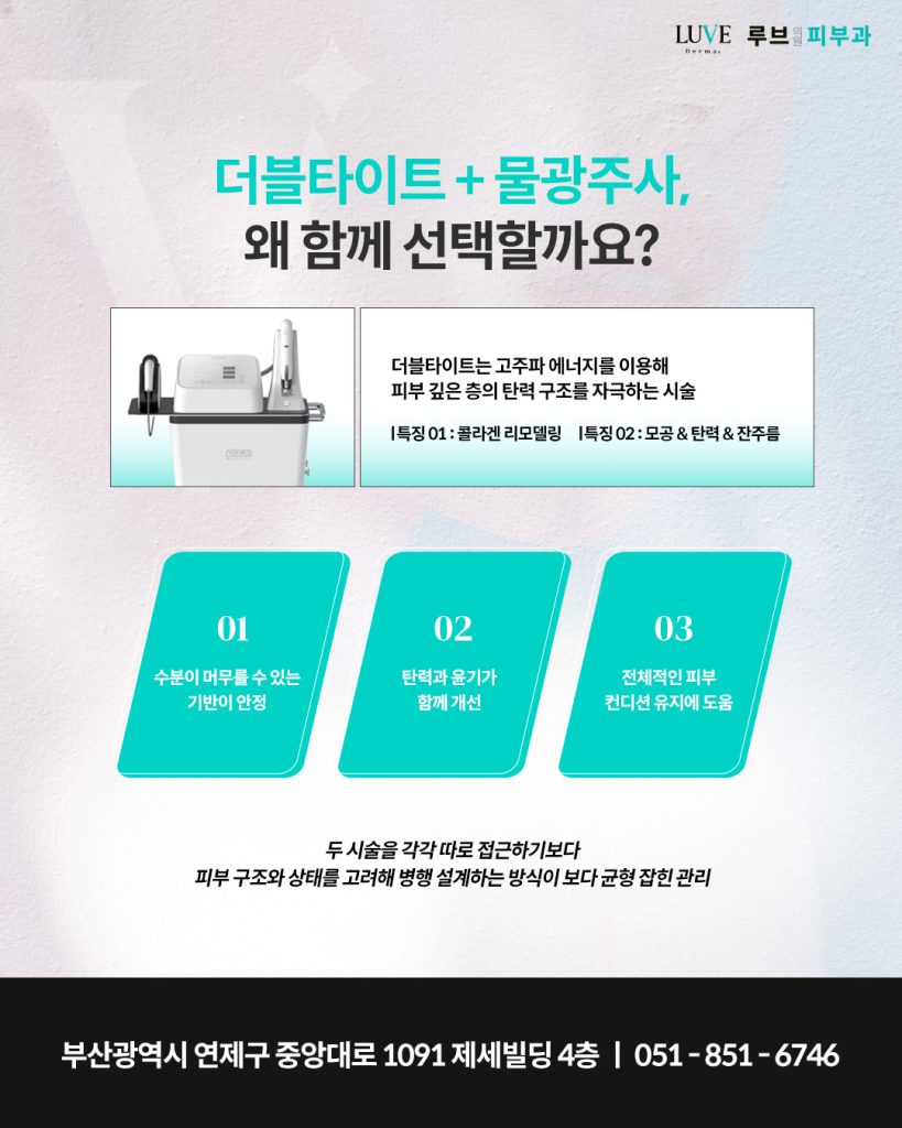 루브를 방문해 주시는 분들 중에서는 센텀물광주사 단독 시술보다는 더블 타이트와 함께 병행하는 경우도 점점 늘고 있습니다.