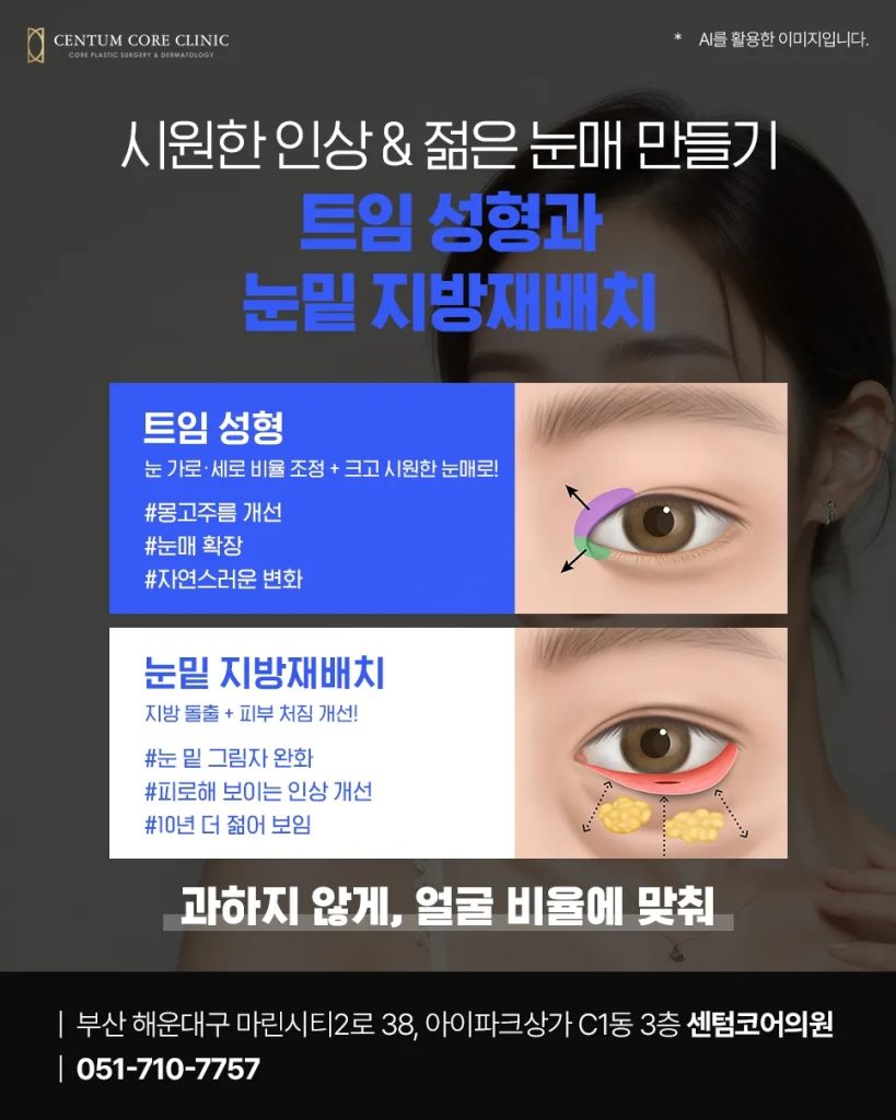 센텀성형외과잘하는곳 센텀코어의원은 환자의 눈 상태를 면밀히 진단한 뒤, 쌍꺼풀·눈매교정·트임·재수술·눈밑지방재배치 등 다양한 방법 중 가장 적합한 솔루션을 제안합니다. 중요한 것은 단순히 큰 눈을 만드는 것이 아니라, 얼굴 전체와 조화를 이루는 자연스러운 변화입니다.