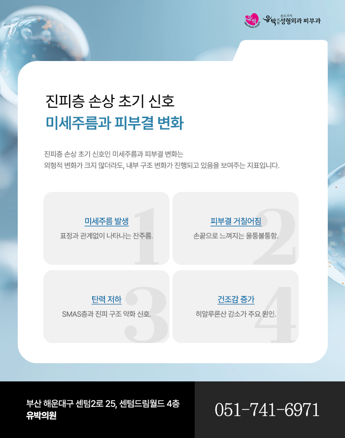 진피층 손상은 단순히 외형적인 문제 뿐 아니라, 피부 기능 저하와도 밀접하게 연결됩니다. 세포외 기질의 밀도가 감소하면 피부 장벽 기능이 약화되고 수분 유지능력이 떨어져 건조함과 민감성 증가로 이어집니다. 또한 미세혈관과 림프관 기능이 저하되면서 피부 세포에 필요한 영양공급이 제한되고 노폐물 제거 효율도 감소하여 초기에는 눈에 띄지 않던 미세주름과 결 변화가 점차 심화될 가능성이 높아집니다.