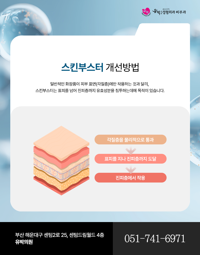 스킨부스터는 조직학적 관점에서 진피층까지의 전달을 목표로 합니다. 표피 하층의 각질세포 및 기저층 세포를 지나, 성분이 진피의 섬유아세포 및 결합조직에 유효성분이 전달되는 원리를 가지고 있습니다. 하지만 스킨부스터 유형에 따라 제형의 점도, 확산 특성, 세포 간 상호작용, 분자크기와 점도에 각기 다른 특징이 있기 때문에 피부상태와 이와 같은 요소들을 고려해보아야 합니다.
