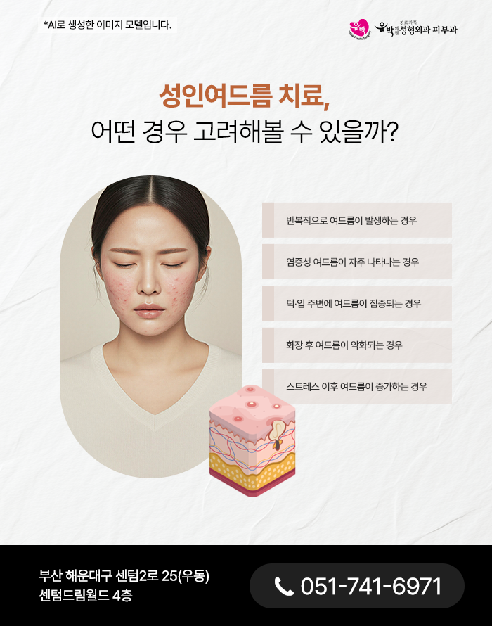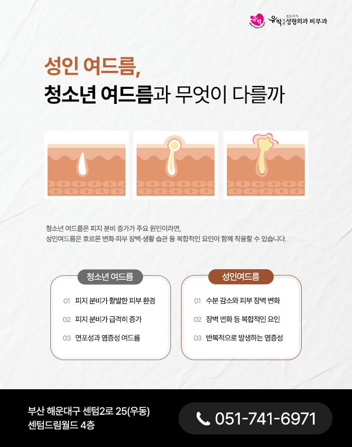 반면 성인여드름은 단순히 피지 분비 증가만으로 설명되기 어려운 경우가 많습니다.