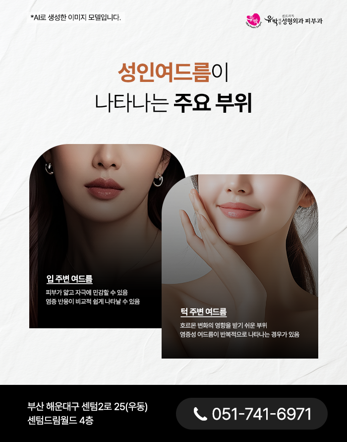 성인여드름은 턱, 입 주변, 턱선 부위에 집중되는 경우가 많습니다. 이러한 부위에 반복적으로 여드름이 나타난다면 호르몬 변화나 생활 습관과 관련된 영향을 함께 고려해볼 수 있습니다.