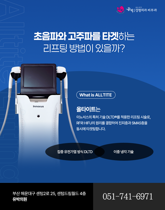 올타이트리프팅은 유전가열이라는 원리를 기반으로 내부 피부층을 가열하는 방식이며 구조적으로 진피 전층과 SMAS부위까지 에너지를 도달한다는 특징이 있습니다. 국제특허 출원기술인 DLTD (Dermis Layer Target Dielectric heating system)는 암치료와 재활치료에서 쓰이던 내부가열 기술을 의료기기에 접목한 리프팅레이저입니다.