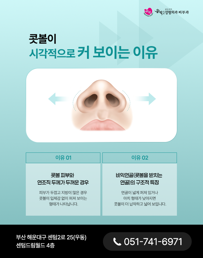 정면에서 보았을 때 얼굴 중심선 대비 콧볼이 넓게 퍼져 있거나, 코 끝과의 비율이 맞지 않아 전체가 둔탁하고 무겁게 보이는 경우가 이에 해당합니다.