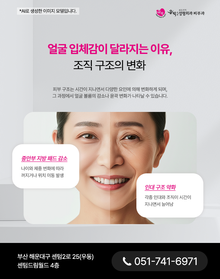 급격한 체중감소가 발생할 경우 얼굴 지방층이 함께 감소하면서 볼륨이 줄어드는 현상이 나타날 수 있으며 스트레스, 자외선 노출과 같은 생활 환경 요인 역시 피부상태와 조직 탄력도에 영향을 줄 수 있습니다.