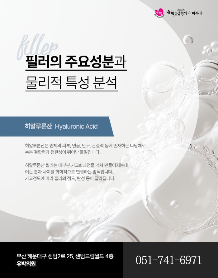 피부의 연조직을 보완하거나 꺼진 부위를 개선하기 위해 사용되는 필러는 사용되는 물질의 분자구조적 특성, 물리화학적 특성, 생체적 상호작용에 따라 다른 특징을 가지고 있습니다. 대표적으로 널리 사용되는 성분은 히알루론산으로, 이는 인체의 결합조직, 유리체, 활액 등 다양한 생리적 환경에서 자연적으로 존재하는 음이온성 고분자 다당류입니다.