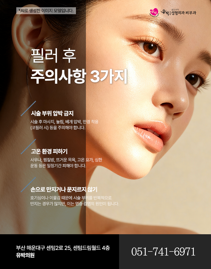 ​시술 직후에는 마사지를 삼가고 베개나 안경의 압착, 무의식적 손 대기, 얼굴을 숙이는 자세 등을 피하는 것이 권장됩니다. 또한 일정기간은 혈류증가와 온도상승이 염증반응을 촉진할 수 있습니다. 사우나, 찜질방, 고온요가, 뜨거운 목욕 등은 체온을 상승시켜 부종과 발적을 악화시킬 가능성이 있어 자제하는 것이 권장됩니다. 또한 격한 운동이나 유산소 활동은 일시적인 혈압상승을 유도해 부위의 미세출혈이나 멍을 유발할 가능성이 있습니다.