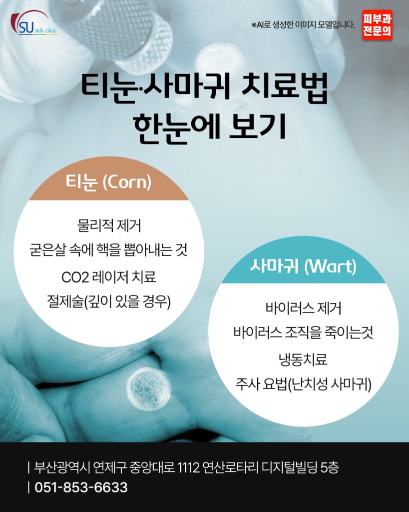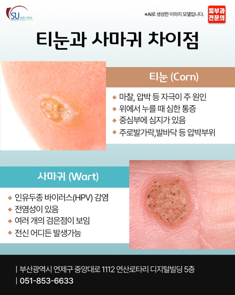 부산피부과전문의 티눈 사마귀 제거를 고민하신다면 겉모양만으로 판단하기보다 직접 진료를 통해 감별하는 과정이 필요합니다.