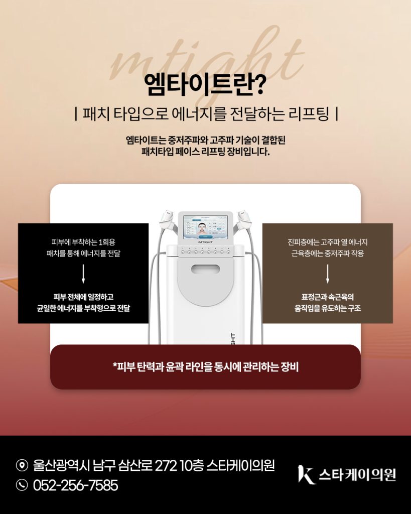 엠타이트리프팅은 이러한 고주파 에너지를 패치 형태로 넓고 균일하게 전달할 수 있어, 피부 전반의 결&윤기&탄력 환경을 정돈하는 데에도 활용됩니다.