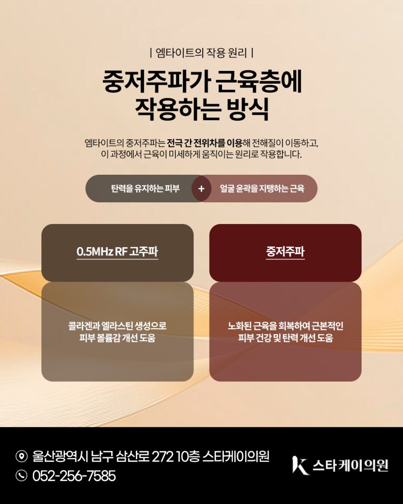 엠타이트리프팅의 중저주파는 전극 간 전위차를 이용해 전해질이 이동하고, 이 과정에서 근육이 미세하게 움직이는 원리로 작용합니다.