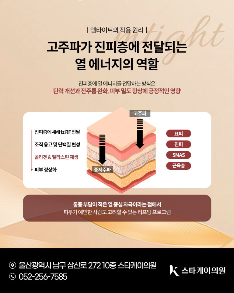 이제는 이러한 복합 구조를 함께 관리할 수 있는 비침습 리프팅 장비가 주목받고 있으며, 그중 중저주파와 고주파를 결합한 패치 타입의 엠타이트리프팅이 활용되고 있습니다.