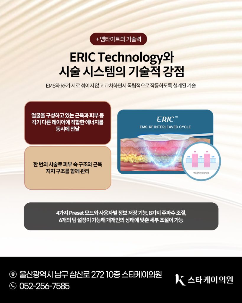엠타이트리프팅의 가장 큰 기술적 특징은 ERIC Technology입니다. 이는 EMS와 RF가 서로 섞이지 않고 교차하면서 독립적으로 작동하도록 설계된 기술로, 근육층과 진피층이 필요한 자극을 동시에 전달받을 수 있게 해줍니다.