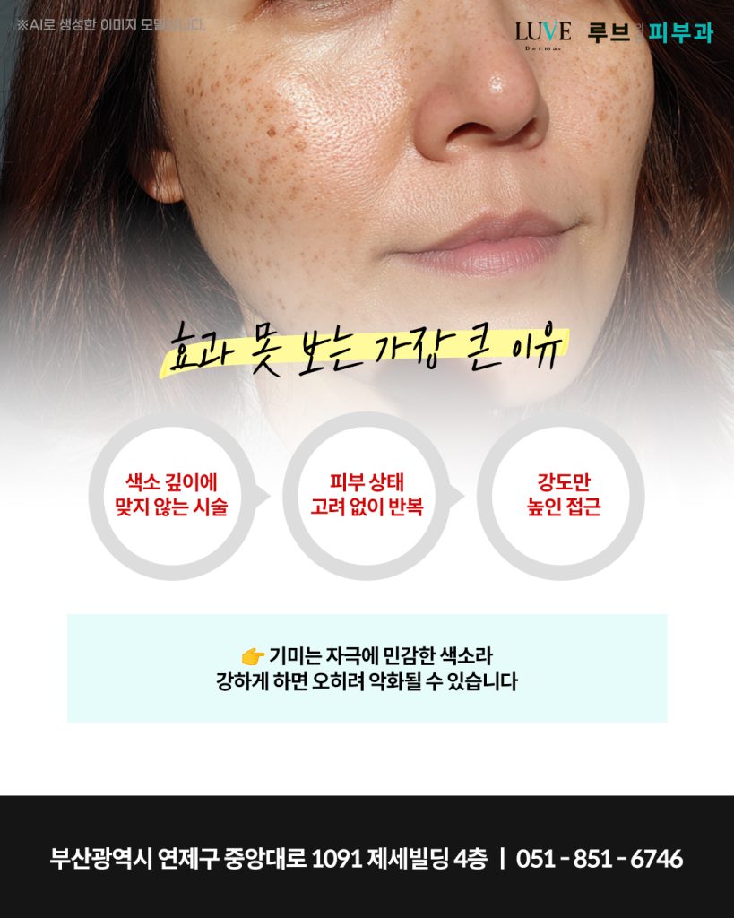 기미는 자극에 민감하게 반응하는 특성이 있어 강한 에너지를 반복적으로 전달하면 오히려 색이 더 짙어지는 방향으로 반응하기도 합니다.