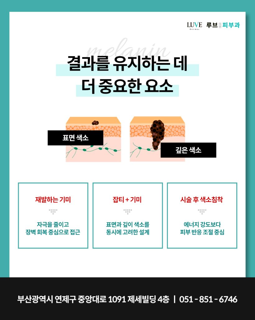 표면 가까이에 있는 색소와 피부 깊은 층에 자리 잡은 색소는 각각 반응하는 방식이 다르기 때문에 한 가지 방식으로만 접근하면 일부만 개선되고 나머지는 남는 경우가 발생할 수 있습니다.