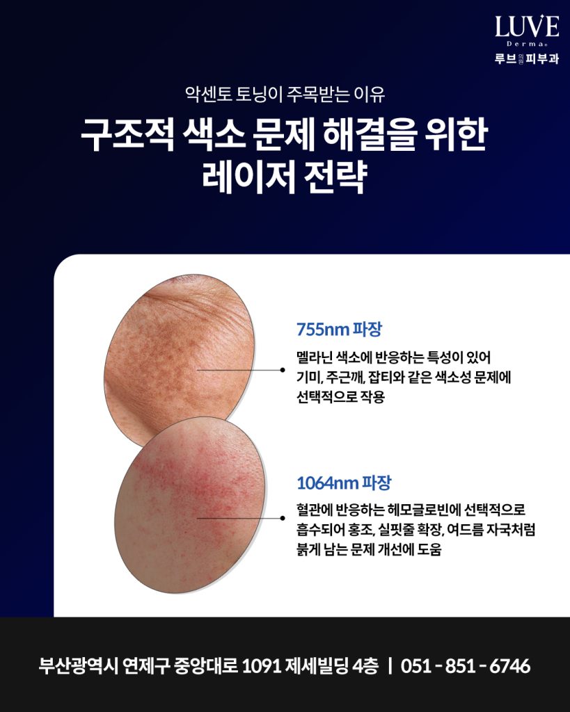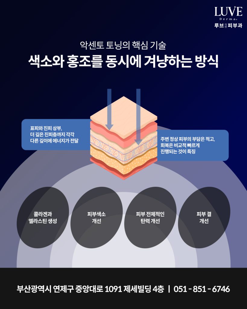 때문에 오늘은 레이저토닝의 한 방법인 악센토 토닝이 어떤 방식으로 작동하는지, 어떤 피부 고민에 적합한지, 그리고 루브의원에서는 어떻게 시술이 이루어지는지 차근차근 안내해 드리겠습니다.