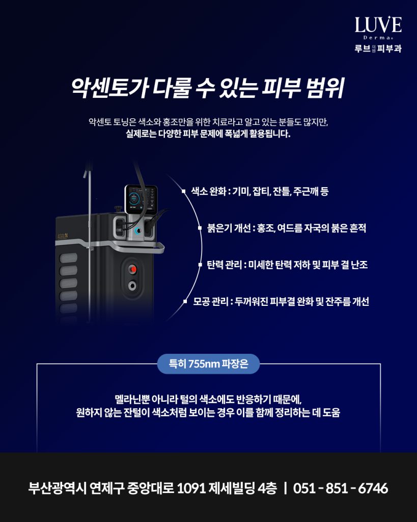 악센토 토닝은 색소와 홍조만을 위한 연산동레이저토닝 치료라고 알고 있는 분들도 많지만, 실제로는 다양한 피부 문제에 폭 넓게 활용됩니다.