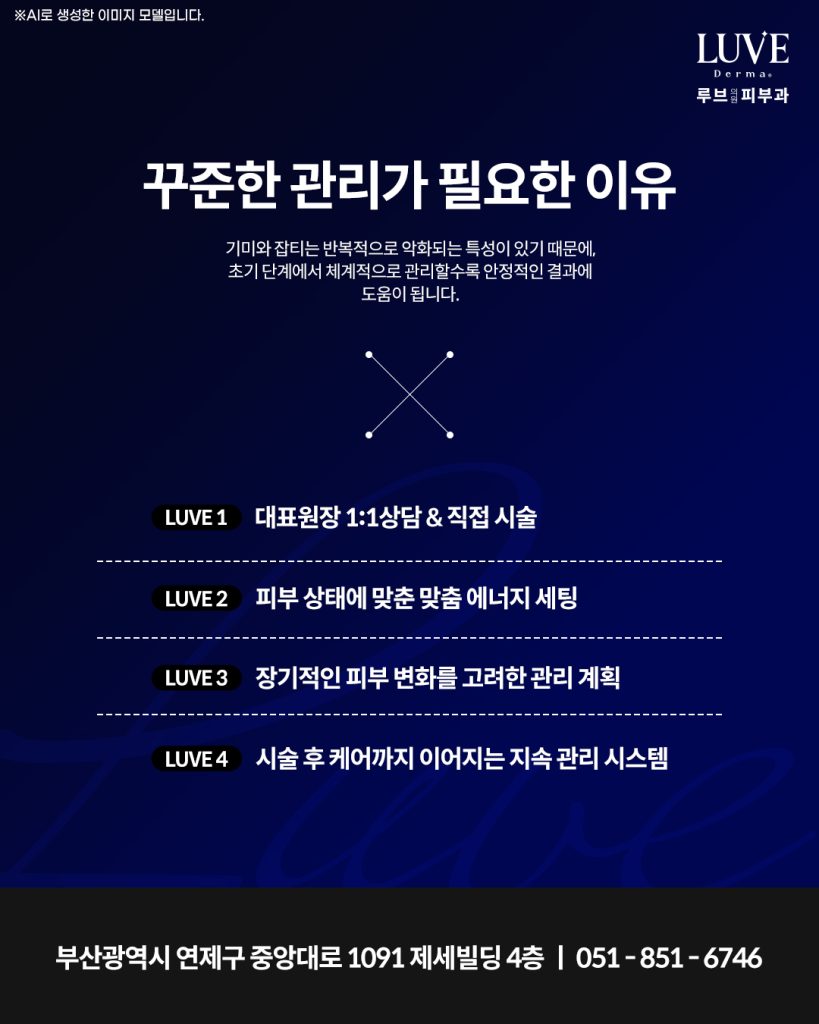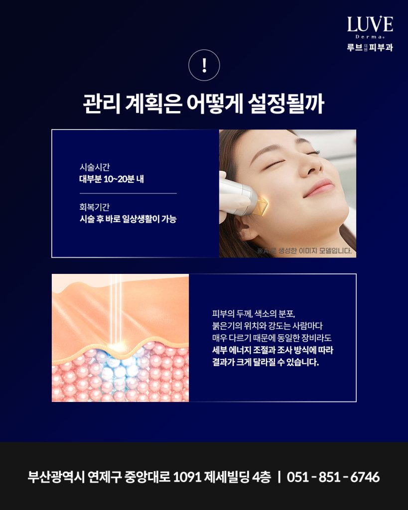 연산동 루브의원에서는 시술 전 충분한 상담과 피부 진단을 통해 개인별 문제를 정확하게 파악한 뒤 에너지 강도와 조사 깊이를 세밀하게 조절하여 보다 자연스럽고 매끄러운 변화를 목표로 시술하고 있습니다.