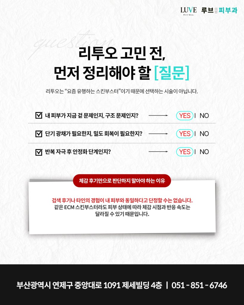 그래서 연산동리투오 검색 후기나 타인의 경험이 내 피부와 동일하다고 단정할 수는 없습니다. 같은 ECM 스킨부스터라도 피부 상태에 따라 체감 시점과 반응 속도는 달라질 수 있기 때문입니다.