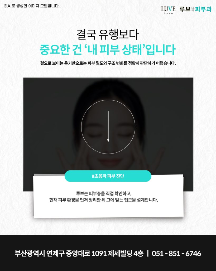 겉으로 보이는 윤기만으로는 피부 밀도와 구조 변화를 정확히 판단하기 어렵습니다. 그래서 루브에서는 초음파 피부 진단 장비를 활용하여 피부층을 직접 확인하고 자극이 필요한 타깃을 설정하는 과정이 함께 이루어지고 있습니다.