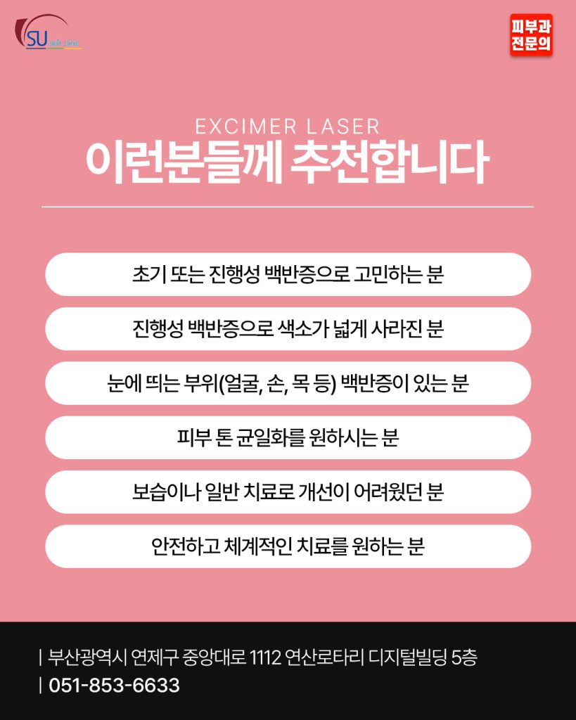 엑시머레이저 치료는 맞춤형으로 병변 부위를 선택해 조사하고,반복 치료를 통해 색소 회복과 피부 톤 개선을 도울 수 있습니다.