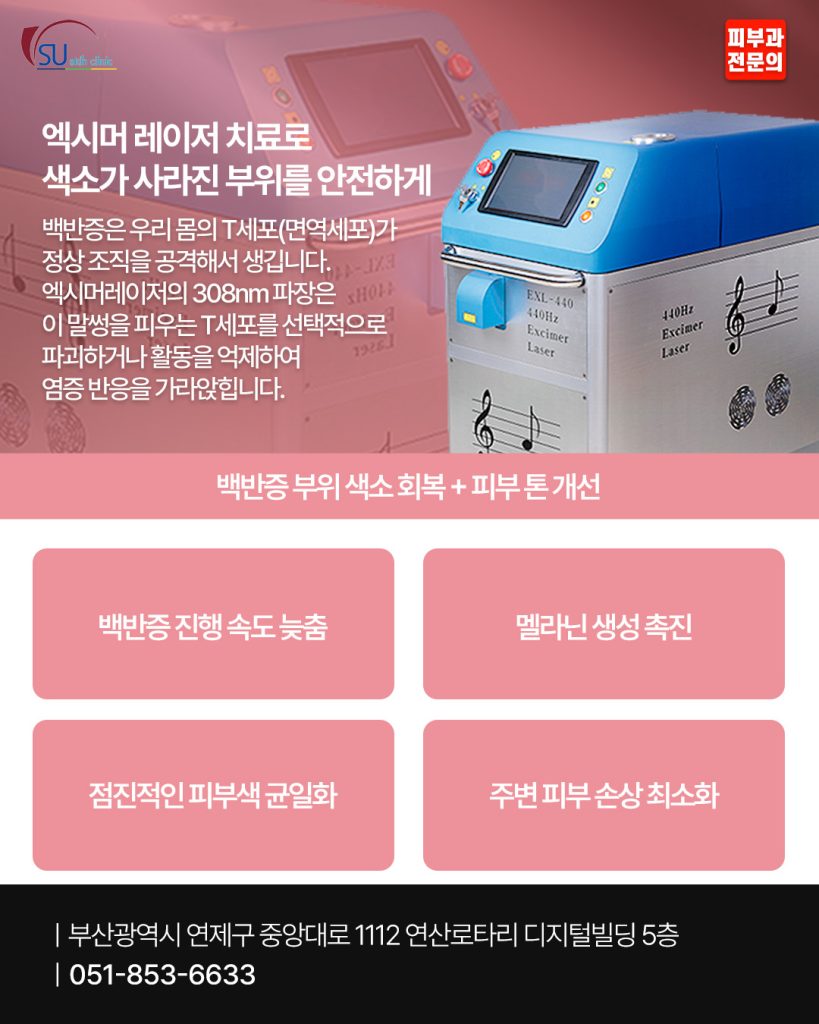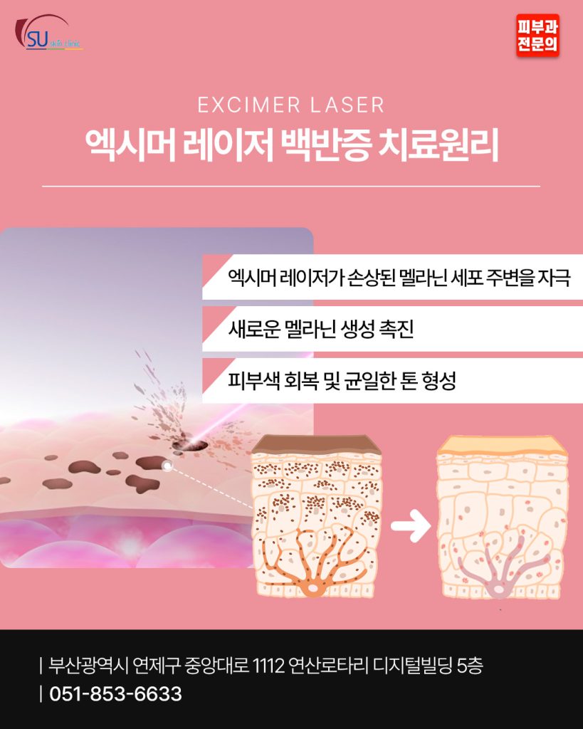 엑시머레이저는 멜라닌 세포 활동을 자극하고 피부 환경을 개선하는 방식으로 작용합니다.