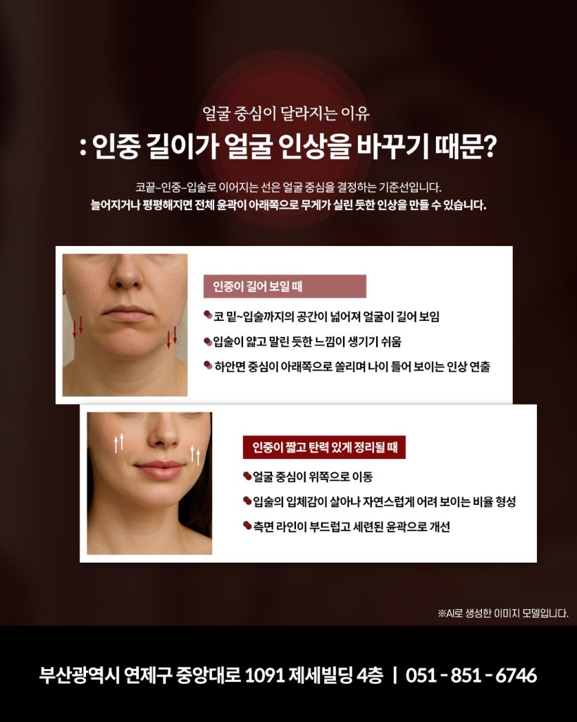 인중이 길어지면 얼굴이 아래로 처져 보이고 표정이 무거워 보이는 경우가 많습니다. 반대로 인중이 짧고 탄탄하게 정리되면 얼굴의 중심이 위로 이동하며 어려 보이는 비율이 자연스럽게 형성됩니다.
