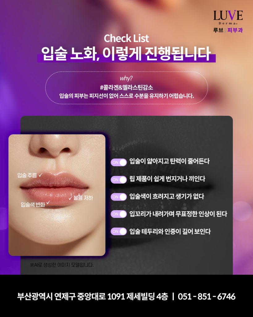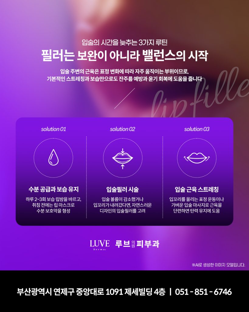 이처럼 입술은 얼굴 중에서도 노화가 빠른 부위이기에 연제구피부과등에서 꾸준히 점검과 연산동입술필러 케어가 필요합니다.
