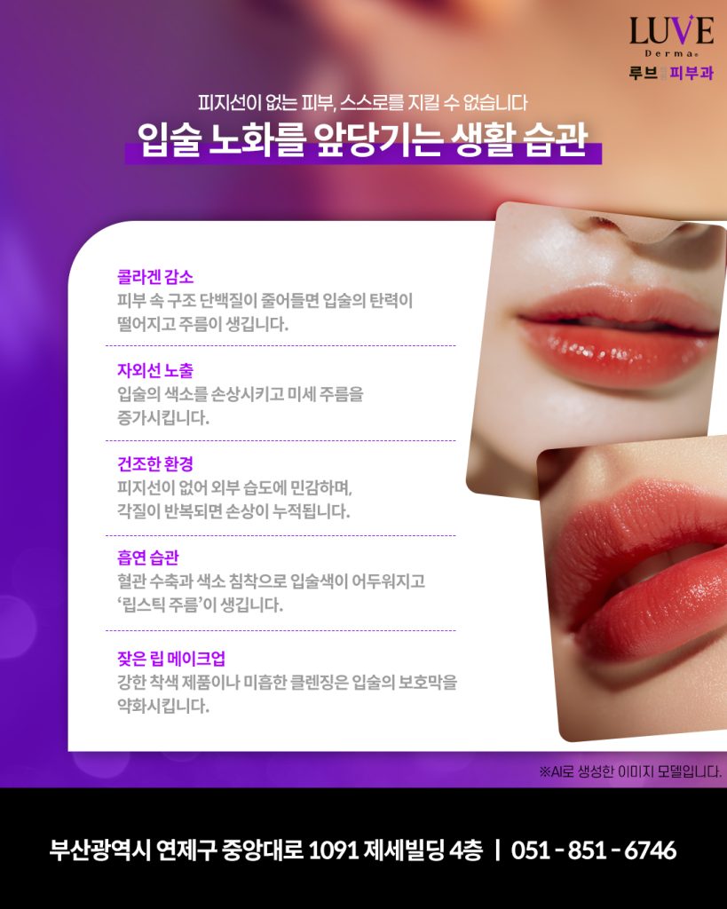입술은 얼굴에서 가장 얇은 피부층으로, 콜라겐 감소와 건조함, 자외선 노출 등에 쉽게 영향을 받습니다.