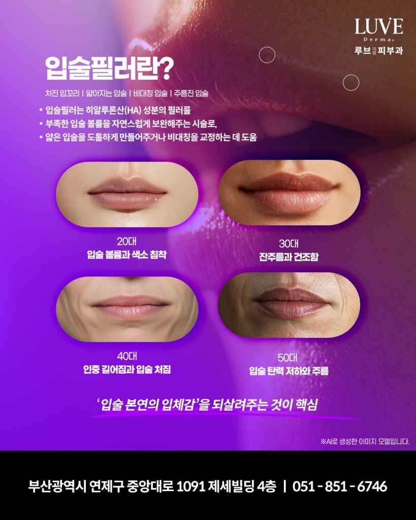 루브의원 연제구피부과에서는 연령별 구조적 차이를 분석하여 입술 중심 볼륨 + 입꼬리 리프팅 + 립라인 윤곽 보정을 함께 설계합니다.