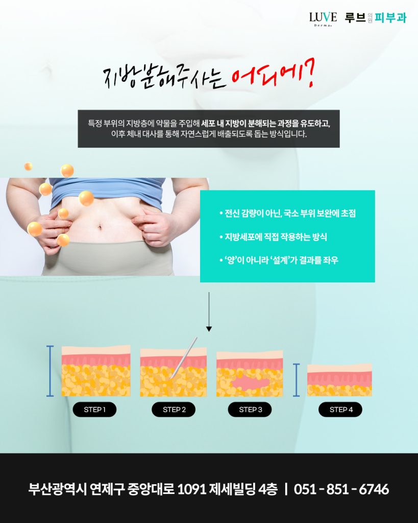 지방분해주사는 특정 부위의 지방층에 약물을 주입해 지방세포에 작용하도록 돕는 시술입니다.