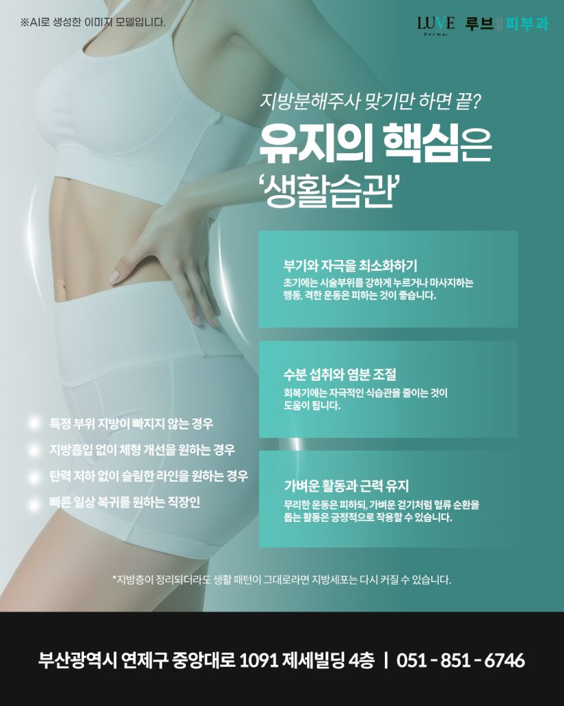 루브는 연산동지방분해주사 시술만으로 끝내지 않습니다. 운동, 식이, 생활 패턴을 함께 조정하는 ‘유지 구조’를 설계합니다.