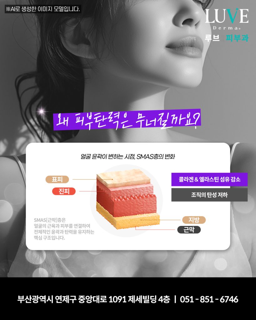 하지만 연제구피부과 시간이 지나면서 SMAS층을 구성하는 콜라겐과 엘라스틴 섬유의 양이 감소하고, 조직의 탄성이 떨어지면 얼굴 전체가 아래로 처지게 됩니다.