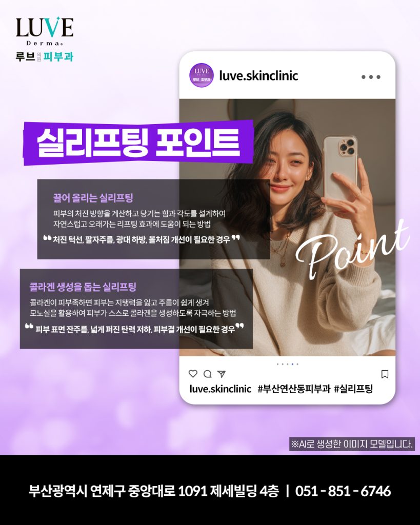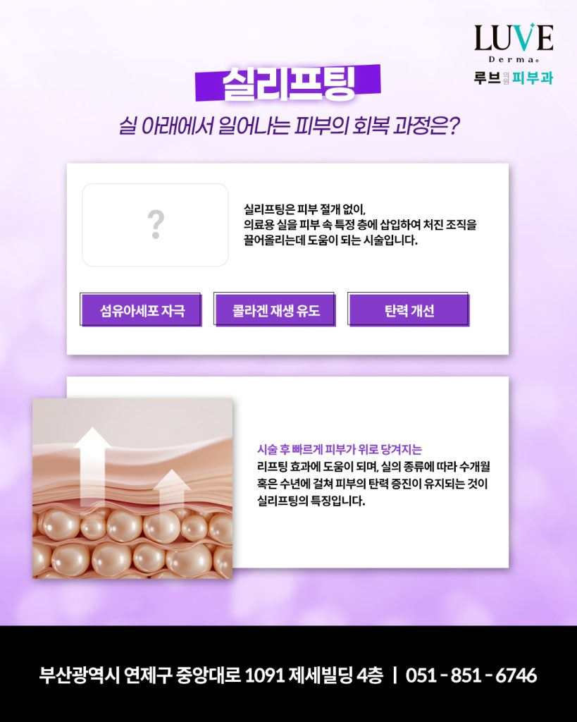 연제구피부과 실리프팅은 피부 속에 특수 의료용 실을 삽입하여 처진 조직을 고정하고 위로 당겨주는 시술입니다.