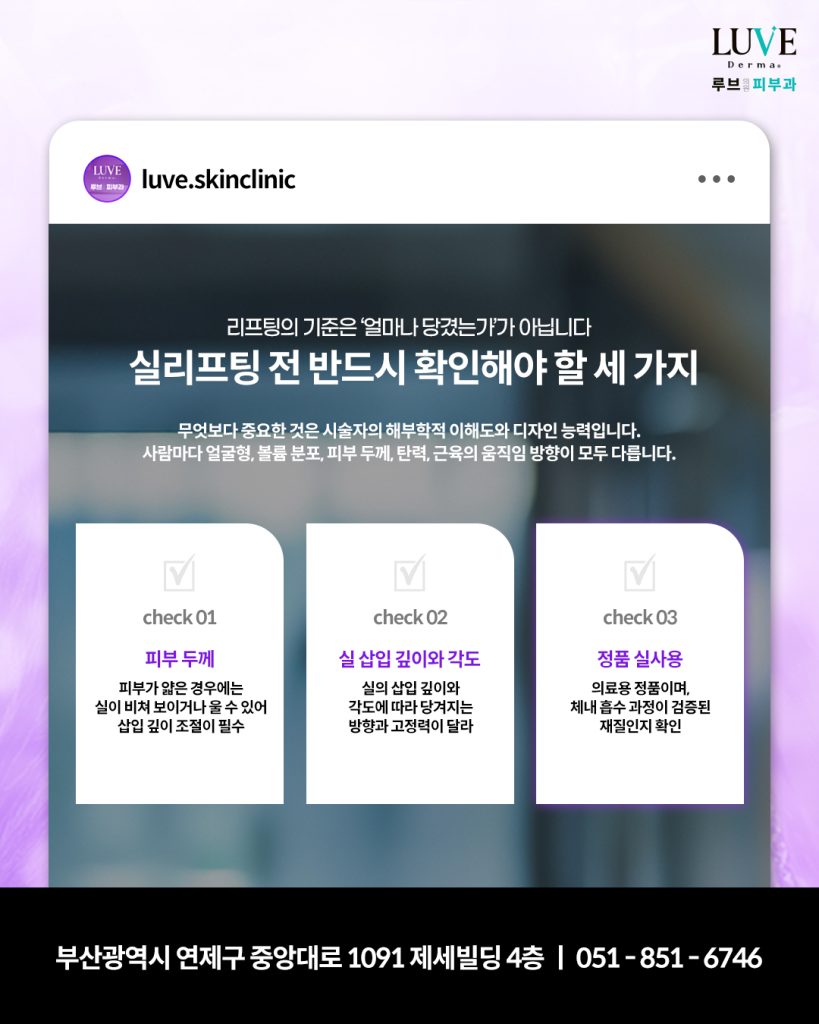 따라서 시술 전에는 피부 상태를 정밀하게 진단하고, 이에 맞는 실의 종류와 당김 각도를 맞춤 설계해야 합니다.