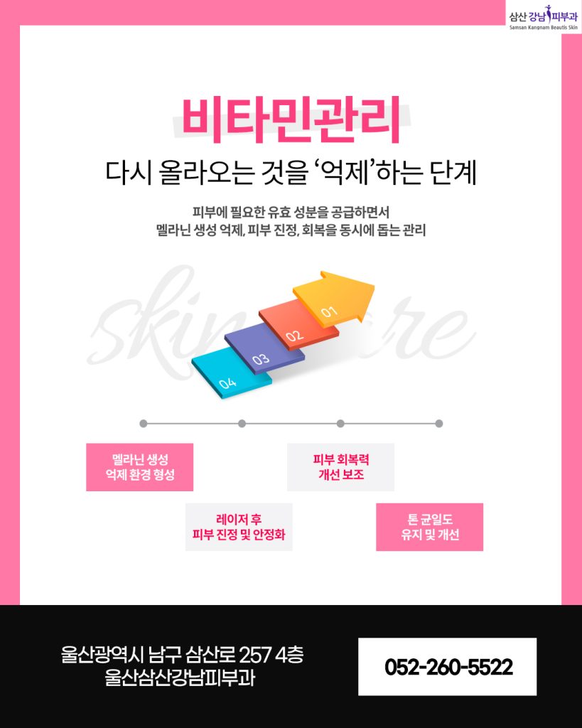 비타민 관리는 피부에 필요한 유효 성분을 공급하면서 멜라닌 생성 억제, 피부 진정, 회복을 동시에 돕는 관리입니다.