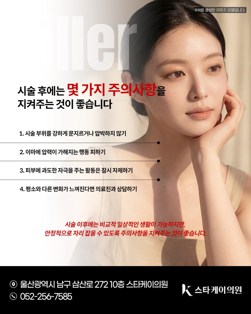 울산남구이마필러 시술 이후에는 비교적 일상적인 생활이 가능하지만, 안정적으로 자리 잡을 수 있도록 몇 가지 주의 사항을 지켜주는 것이 좋습니다.