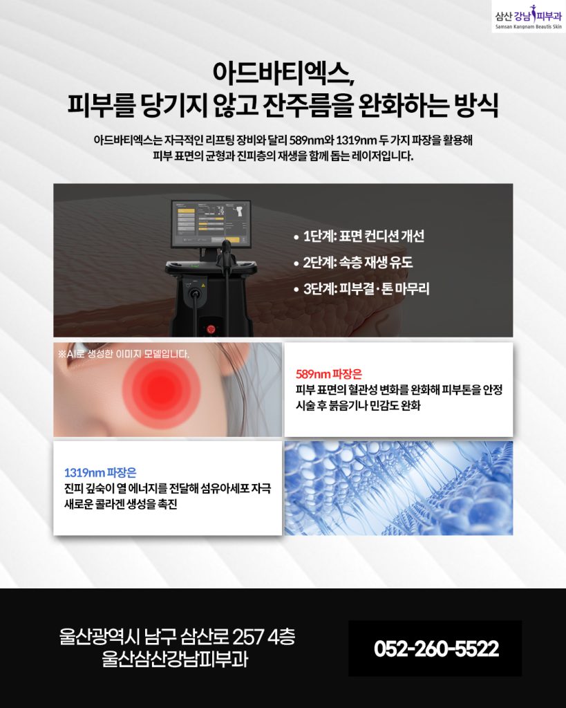 울산남구피부과 아드바티엑스는 자극적인 리프팅 장비와 달리 589nm와 1319nm 두 가지 파장을 활용해 피부 표면의 균형과 진피층의 재생을 함께 돕는 레이저입니다.