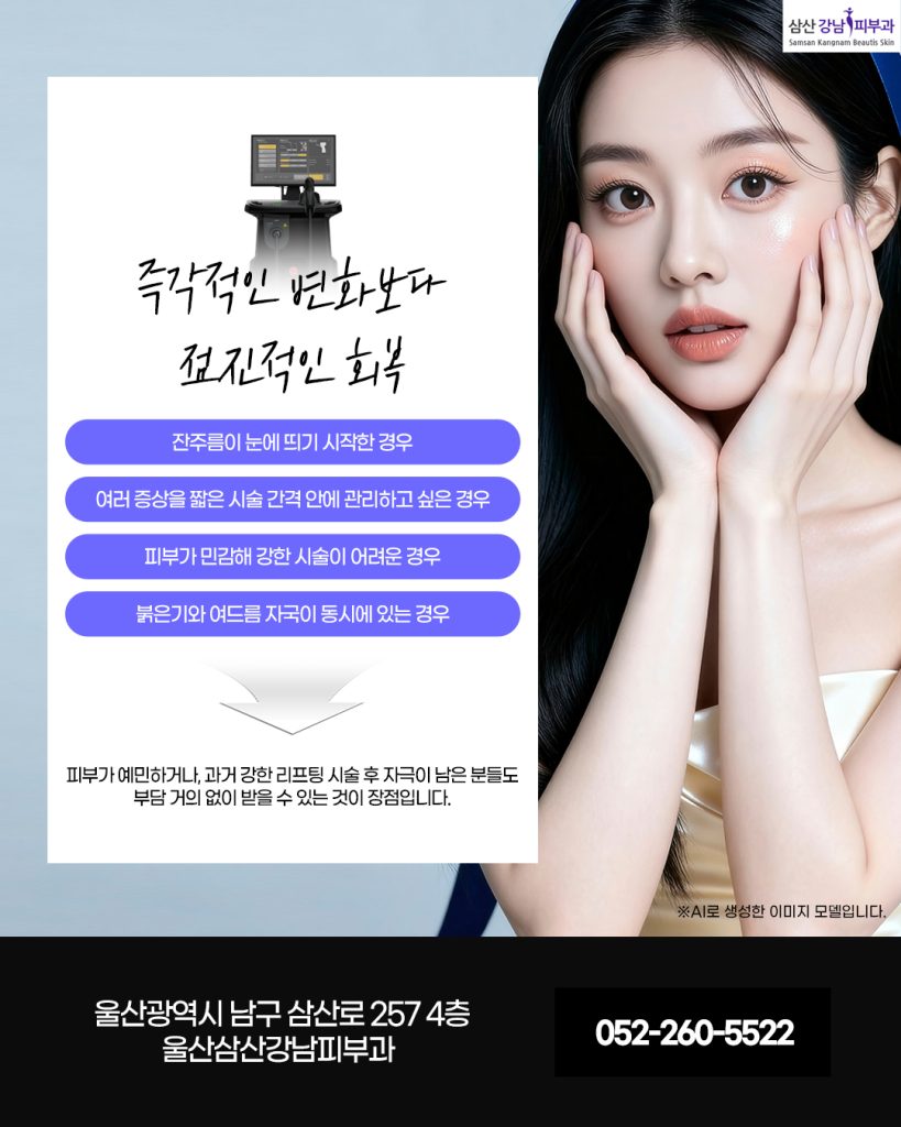 울산남구피부과에서는 보통 3~4주 간격으로 3~5회 정도의 관리 주기를 권장하며, 각자의 피부 상태와 주름 깊이에 따라 맞춤 파라미터를 적용합니다. 피부가 예민하거나, 과거 강한 리프팅 시술 후 자극이 남은 분들도 부담 없이 받을 수 있는 것이 장점입니다.