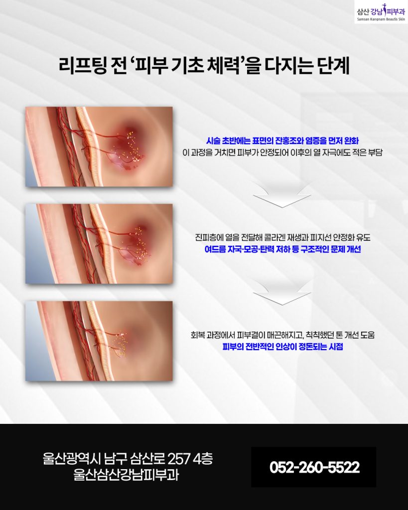 이 과정을 통해 피부는 스스로 탄력을 회복하며 얇게 접히던 미세한 선들이 완만하게 펴지게 됩니다. 한마디로, 피부를 ‘당기는 리프팅’이 아니라 ‘ 속에서 차오르는 울산남구피부과 리프팅’을 유도한다고 볼 수 있습니다.