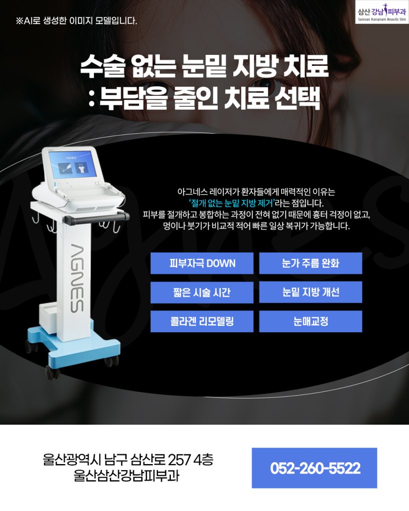 예전에는 울산눈밑지방제거라 하면 절개 수술을 떠올렸지만, 최근에는 절개 없이 미세 바늘을 통한 고주파 에너지 시술이 가능해졌습니다. 이는 바로 아그네스 레이저입니다.