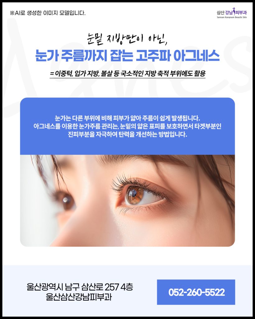 피부과 전문의들이 활용하는 아그네스는 눈가처럼 연약한 부위에도 적용할 수 있으며 불필요한 지방만 선택적으로 줄이고 동시에 콜라겐 재생을 촉진하는 점이 특징입니다.