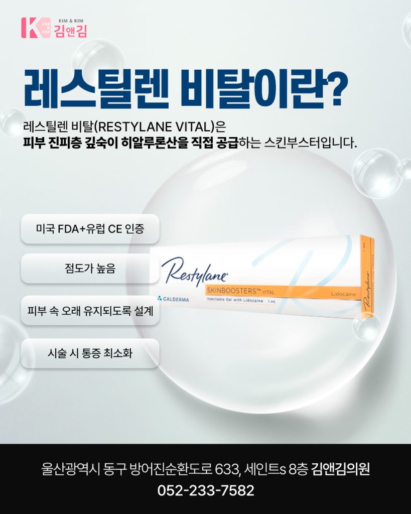레스틸렌 비탈(Restylane Vital)은 피부 진피층 깊숙이 히알루론산을 직접 공급하는 스킨부스터입니다.