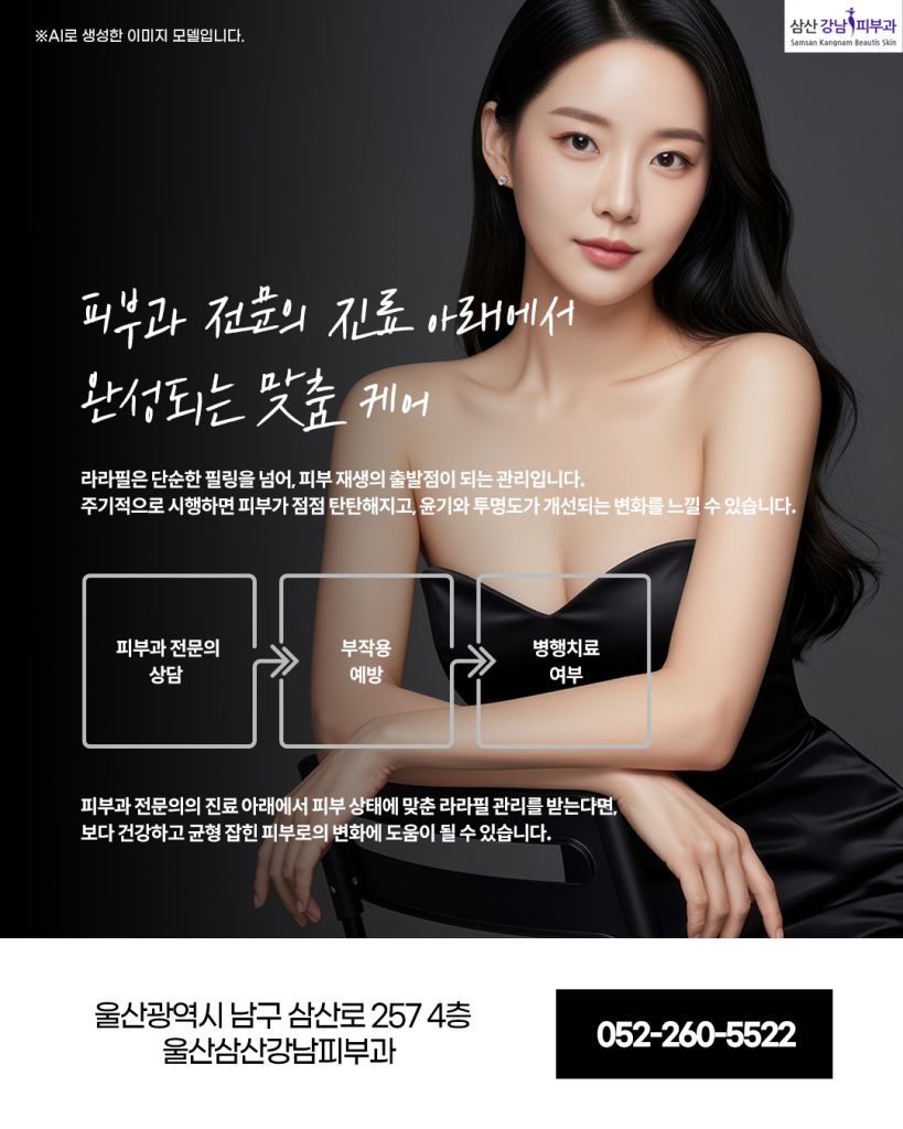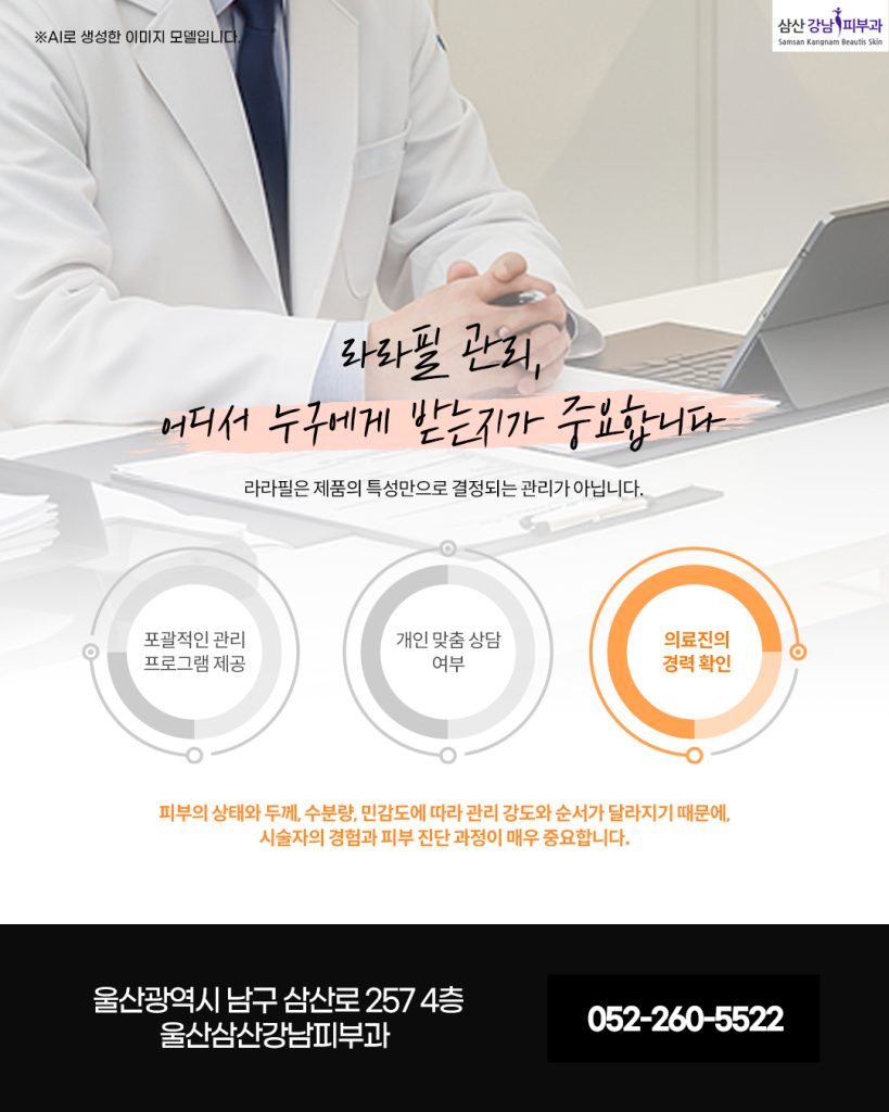 피부과 전문의의 진료 아래에서 피부 상태에 맞춘 라라필 관리를 받는다면, 보다 건강하고 균형 잡힌 피부로의 변화에 도움이 될 수 있습니다.