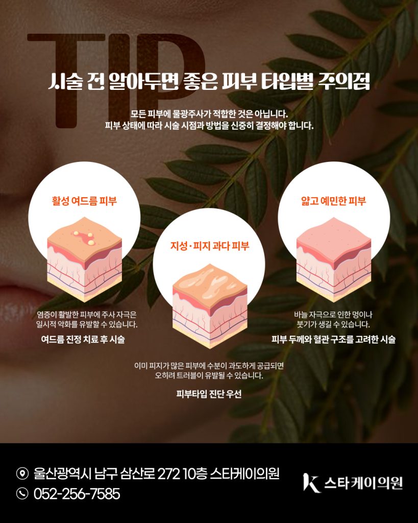 모든 피부에 물광주사가 적합한 것은 아닙니다. 피부 상태에 따라 시술 시점과 방법을 신중히 결정해야 합니다.